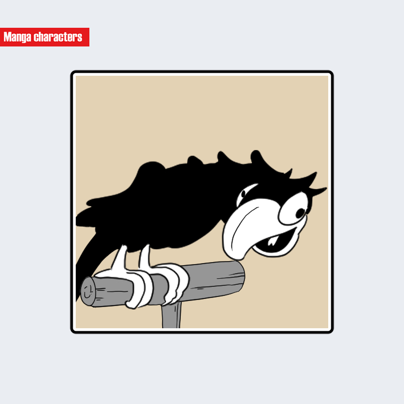 『蒸気船ウィリー』に登場するオウムは、全身を黒い塊状のシルエットとして描き、白い目と嘴のみを強調した造形が特徴である。頭部は鋭角的な前傾姿勢で描かれ、嘴は大きく湾曲し上下のラインが強いコントラストを生む「擬獣化デフォルメ型」の構造に分類される。肩から翼にかけては黒面を大きな一枚として処理し、脚は細く白い爪が枝状に配置されている。止まり木に前傾姿勢で乗った構図が、黒いシルエットの重量感と前向きの動勢を視覚階層として形成している。