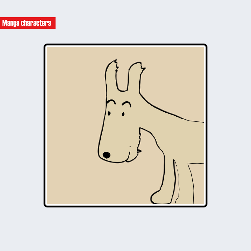 『タンタンソビエトへ』に登場するスノーウィは、細長い鼻先と大きく立ち上がった二本の耳を特徴とする、白色の簡略動物造形である。頭部から背中にかけては連続する細い曲線で構成され、顔面パーツは目・鼻が最小限の点と短い線で示された「擬獣化簡略型」の構造に分類される。輪郭線は均一の細さで、毛並みの表現を省いた滑らかな外形となっている。前脚・後脚は細長い棒状の線で処理され、写実性よりも記号性を優先した描写が確認できる。全体として、耳の高さと鼻先の細いシルエットが視覚階層の中心となる。