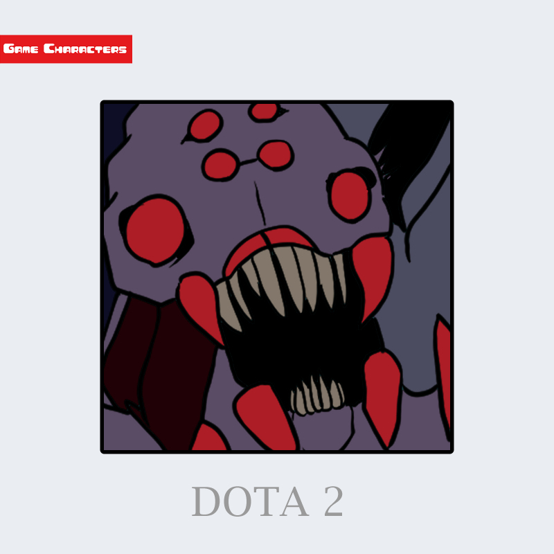 『Dota 2』に登場するブルードマザーは、全体的に節足動物を思わせる構造を持つキャラクターである。頭部から胴体にかけて紫色の外殻が連なり、赤色の球状突起が対称的に配置されている。口部は大きく開き、多層の牙状構造が内側に並ぶことで捕食的要素を強調する。人型要素はほとんどなく、脚部や外殻配置から「多脚甲殻構造」に分類される。金属的な硬質質感が視覚的にも強く、同作の人型キャラクター群とは明確に異なる構成をとる。