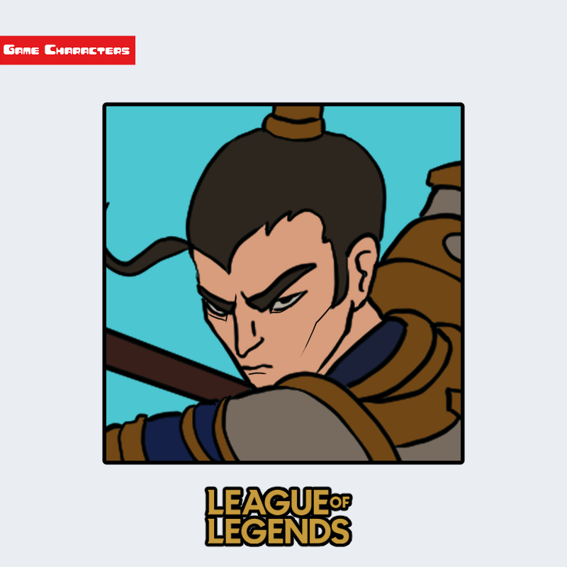 『リーグ・オブ・レジェンド』に登場するシン・ジャオは、古代東方の戦士をモチーフとした男性型キャラクターであり、「戦装槍士型構造」に分類される。黒髪を高く結い上げ、上半身は金属製の胸甲と肩装を備えた鎧で覆われている。衣装の主色は紺と金で、腰帯や腕甲に至るまで装飾的な金属縁取りが施されている。下半身は動きやすさを重視した布と装甲の混合構造で、機動性と防御性の両立を意識した設計となっている。同作品内の軽装戦闘型(例:アカリ)よりも、軍装的意匠が強い。
