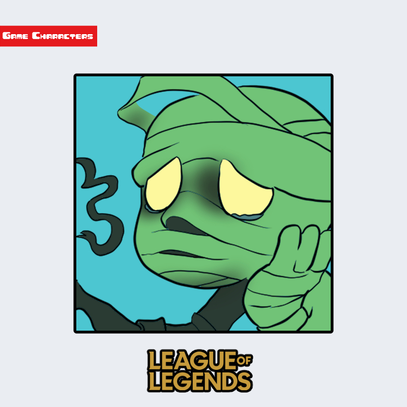 『リーグ・オブ・レジェンド』に登場するアムムは、全身を包帯で覆った小柄な存在であり、「ミイラ擬人型構造」に分類される。身体全体が緑がかった包帯で巻かれ、表面には年代を感じさせる質感がある。目は大きく、青い涙のような発光が見られ、感情表現を排除した造形ながら強い視覚的印象を与える。手足は短く丸みを帯びており、他キャラの人間型構造(例:ヴァイ、イレリア)と異なり、デフォルメ的な体型バランスを持つ。