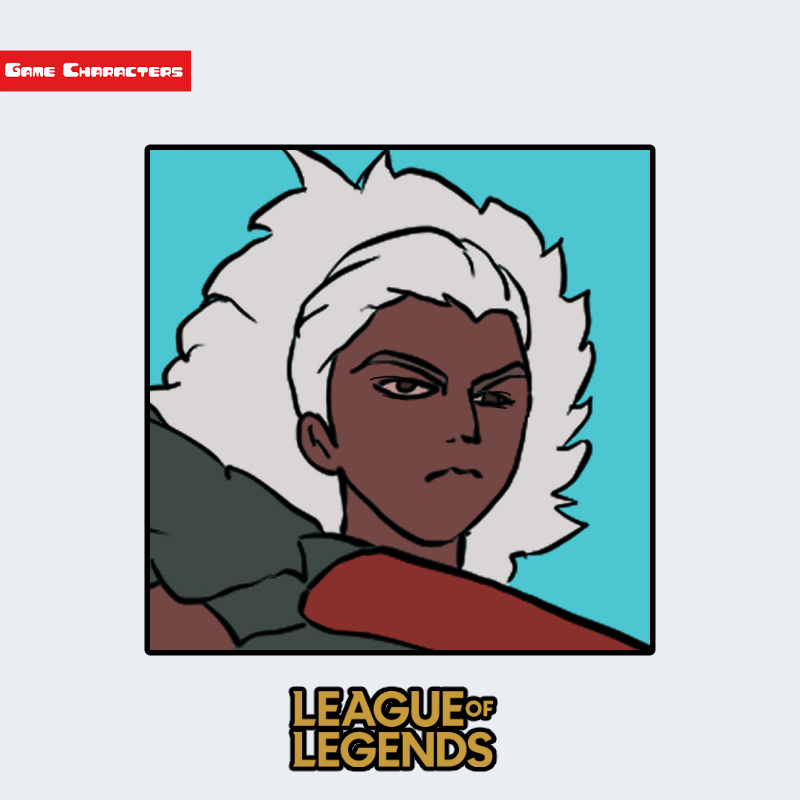 『リーグ・オブ・レジェンド』に登場するアンベッサは、重厚な金属装甲と逞しい肉体を併せ持つ女性型キャラクターであり、「重装戦闘型構造」に分類される。白銀の髪を短くまとめ、肩から腕にかけては巨大な刃状パーツが装着されている。装甲は黒と銀を基調とし、腰部には赤布が巻かれており、全体の構図に力強い対称性を生み出している。腕部と胸部の金属構造は実用性と儀礼性の両面を備え、同作品内の軽装型(例:ヴェイン)とは対照的な重量設計となっている。