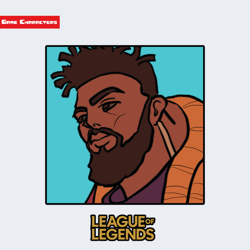 『リーグ・オブ・レジェンド』に登場するカ・サンテは、厚みのある衣装と円形装飾を特徴とする大型体格の男性型キャラクターである。紫と赤を基調とした重布装束に、金属装飾が複数配置された「儀礼戦闘服構造」に分類される。肩部と胸部を覆う縄状の装飾は力強さと象徴性を兼ね備え、円盤状の文様が文化的意匠を示している。体格は極めて頑強で、同作品内の軽装型キャラ(例:カタリナ)とは対照的に防御的・象徴的な衣装設計を持つ。
