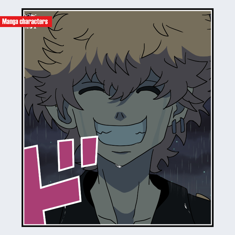 『東京リベンジャーズ』に登場する河田ナホヤは、外側へ大きく広がるボリュームのあるウェーブ髪と、頬から顎にかけて影を大きく落とした立体的な輪郭が特徴である。髪は細かな束が複数方向へ跳ね、面と線の混在で構成された「多層束髪型」の構造に分類される。顔は目元の暗い陰影が強調され、細い眉と大きく開いた口が線と面の対比を生む。耳には複数のピアスが装着され、髪の乱流的なシルエットとは異なる規則的な点状アクセントとなっている。全体として、髪の量感と口元の強い形態が視覚階層の中心を形成している。