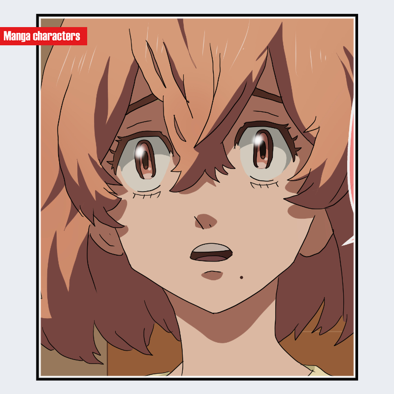 『東京リベンジャーズ』に登場する橘日向は、柔らかく広がる波状の髪束が顔周りを包み込むように配置された造形が特徴である。髪は複数の層が不規則に重なる「多層ウェーブ型」に分類され、前髪は額へ向けて斜めに流れる束が強調されている。目は大きく、上下のまつ毛線が長く伸びることで視線の強い焦点を形成する。輪郭は滑らかな曲線で構成され、顎先は丸みを帯びて簡略化されている。上半身は淡いカラーの衣服が可視範囲を占め、髪の動的なシルエットと対照的に衣装線は静的で最小限の処理になっている。
