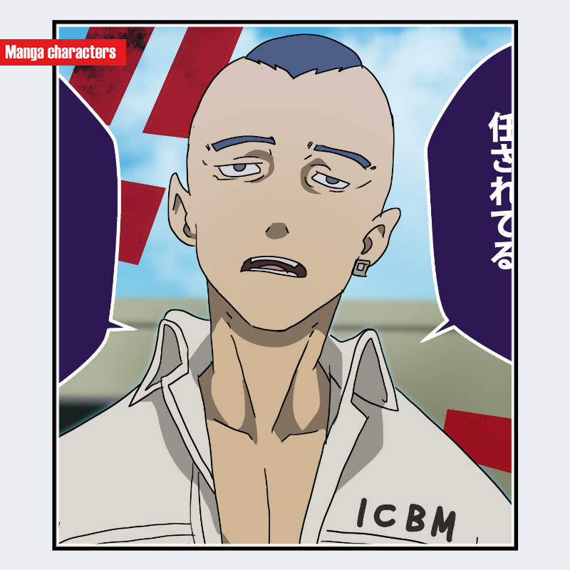 『東京リベンジャーズ』に登場する阪泉は、頭部全体が均一に処理されたスキンヘッド構造を持ち、髪要素が排除された「スキンヘッド型」に分類される。眉は細く直線的で、目元は瞼のラインが落ち込み気味に描写され、表情の重心が上半顔に集中する構造となっている。鼻・口のラインは最小限の筆致で構成され、輪郭は角の少ない丸み寄りの直線混合型である。衣装は開襟シャツが可視範囲を占め、襟と胸元の大きな開きが頭部の造形を相対的に際立たせている。