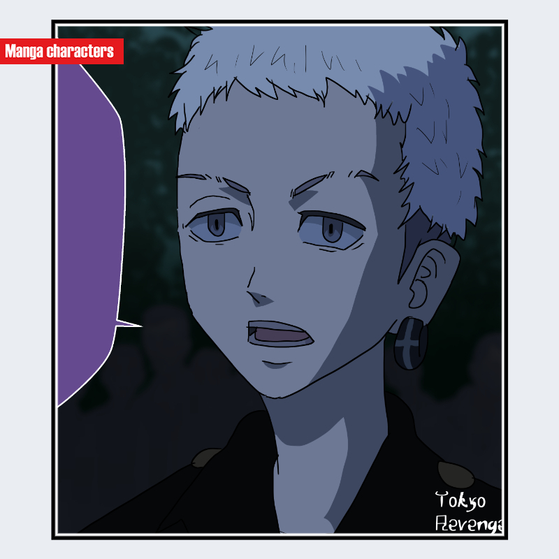 『東京リベンジャーズ』に登場する三ツ谷 隆は、短く刈り込んだサイドと上部のやや無造作な束感を併せ持つ髪型で、全体として「ショート束感型」に分類される。目は細めの切れ長で、上瞼の角度がやや下がりつつも瞳の描線が強く、表情の重心が目元に集中する構造となっている。輪郭は直線寄りのシャープな顎線で構成され、耳には特徴的な円形のピアスが装飾ポイントとして配置されている。衣装は襟を軽く開いたシャツが可視範囲を占め、首元の陰影処理が顔・髪の造形を強調する視覚階層を形成する。