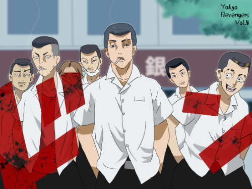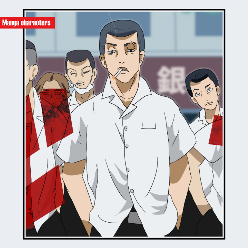 『東京リベンジャーズ』に登場する清水将貴(キヨマサ)は、短く刈り込んだ黒髪と角ばった輪郭を持つ人物として描かれている。上半身は白い半袖シャツで統一され、襟元や裾のシルエットがシンプルに整理された制服融合型の造形である。口元に細いタバコを加えている点が視覚記号として強調され、全体的に直線的な身体線が周囲のキャラより硬質に見える。背後には同系統の服装をした複数の人物が配置され、同一集団としての構造的まとまりが示されている。