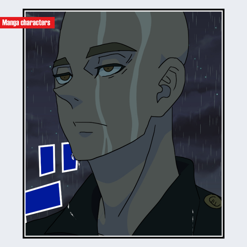 側頭部の刈り上げと金色トップの組み合わせは他作品にも類似軸があるが、本キャラは「隊服の金色文字装飾」と「縦長シルエットの頭部構造」により明確に識別できる。