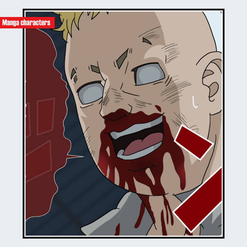 『東京リベンジャーズ』に登場する林田春樹は、明るい金髪をサイドから後頭部にかけて刈り上げ、前方へ流すようにまとめた短髪スタイルが基礎構造となっている。頭部は横幅が広めに描かれ、額から眉にかけての直線的な描線が強調される。隊服は黒地に金色の文字装飾を施した「制服融合型」で、胸部から肩にかけて複数の刺繍が可視化されている。画像の一部では顔面に赤色の液体が付着しているが、これは視認情報としての色彩要素にのみ留め、外観構造として扱う。