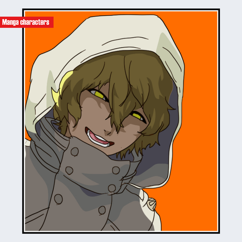 『BLEACH』に登場するグレミィ・トゥミューは、厚みのあるフードの内側から乱れた中長のウェーブ髪がこぼれる「フード一体型シルエット」を持つ。髪色は淡いブラウン系で、前髪が目元にかかることで顔上部の輪郭が部分的に遮蔽されている。フードと上衣は灰色を基調とし、複数のボタンを縦に並べた衣装構造が確認できる。眼は強い黄色の発色で描かれ、瞳孔を細く描くことで視覚的なアクセントとして機能している。