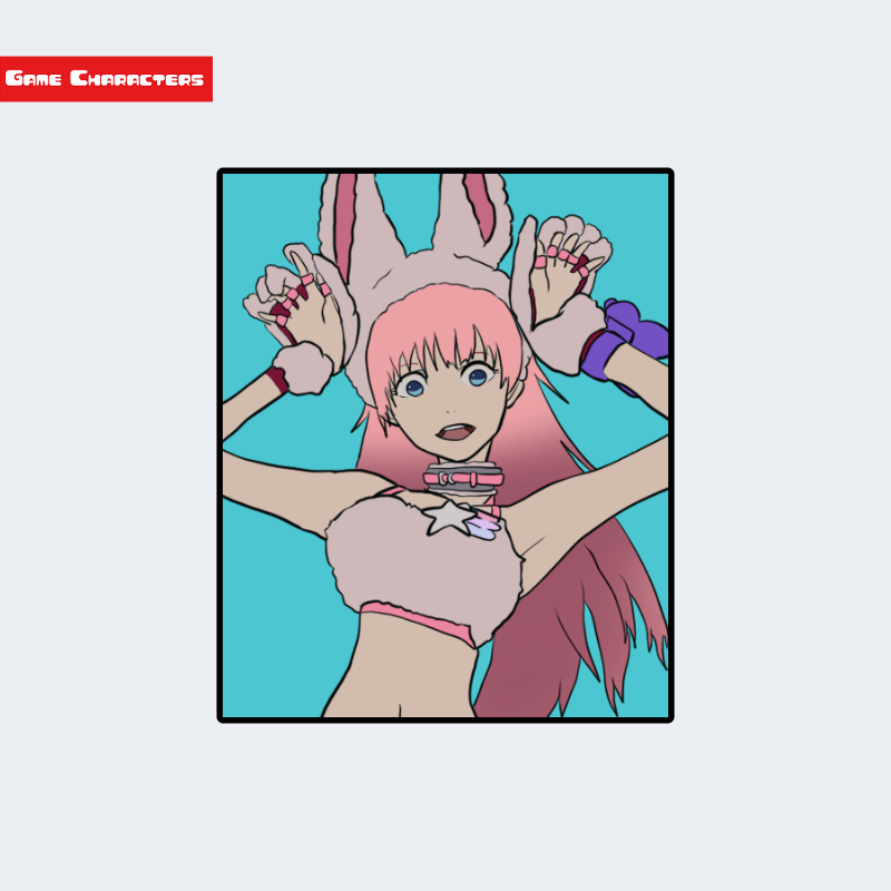 『AI:ソムニウム ファイル』に登場する左岸イリスは、ピンク色の髪と衣装を特徴とする女性キャラクターである。髪は長く背中まで届くストレートで、前髪を厚く下ろした構成。頭部にはウサギの耳を模したフード型アクセサリーを装着しており、全体的に遊び心を持つデザインである。衣装は淡いピンクのトップスと手首のリストバンドで構成され、「装飾融合型」に分類される。腕を上げたポーズと配色の統一性が視覚的な印象を強めている。