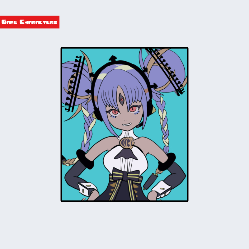 『AI:ソムニウム ファイル』に登場する明美は、淡い紫色の髪をツインテールに結った女性キャラクターである。髪は左右で三つ編みにまとめられ、根元には黒いリボン状の装飾が見られる。額には楕円形の装飾パーツが配置され、機械的要素を感じさせるデザイン構造を持つ。白と黒を基調とした衣装は上半身にフィットしており、胸元に金色の装飾と帯状の構造が組み込まれている。全体の造形は「人工装飾融合型」に分類され、視覚的にも人型と機械的意匠が共存している。