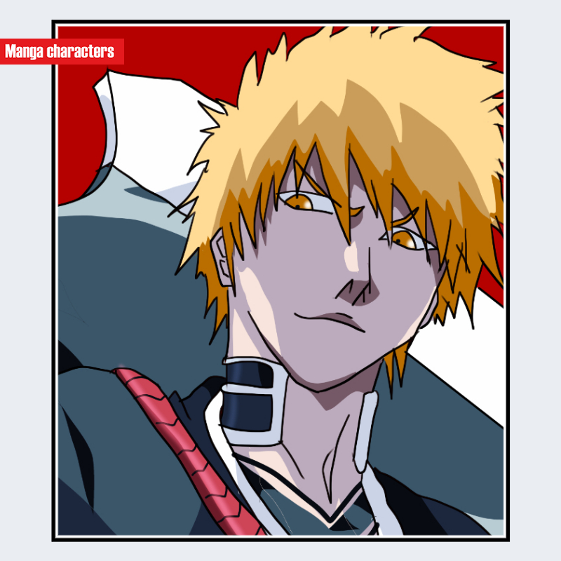 『BLEACH』に登場する黒崎一護は、外向きに散らした短〜中距離の金髪スパイクを持つ「ランダム外跳ね型」の髪構造が特徴である。髪束は大小が混在し、頭部全体に不規則な段差を作る配置となっている。衣装は黒系の和装上衣を基層に、首元へ白い布パーツを巻くように重ねた二層構造で、肩から背面にかけて赤色レイヤーが部分的に視認できる。首元の帯状パーツが前面シルエットを区切り、髪束と衣装レイヤーによって上半身の視覚階層が段階化されている。