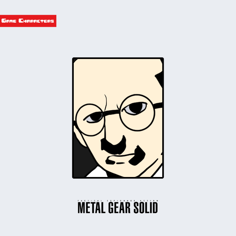 『メタルギア』シリーズに登場するキオ・マルフは、丸眼鏡と短い口髭を特徴とする人間型キャラクターである。頭部は剃り上げられており、額と頭頂部にかけて髪のない構造を持つ。顔の下部には濃い影が描かれており、鼻梁が強調された線構成となっている。眼鏡のフレームは細く、左右対称に配置されている。全体として「人間型」かつ「学術装備構造」に分類され、視覚的に知識職や技術職的印象を持つ造形が採用されている。