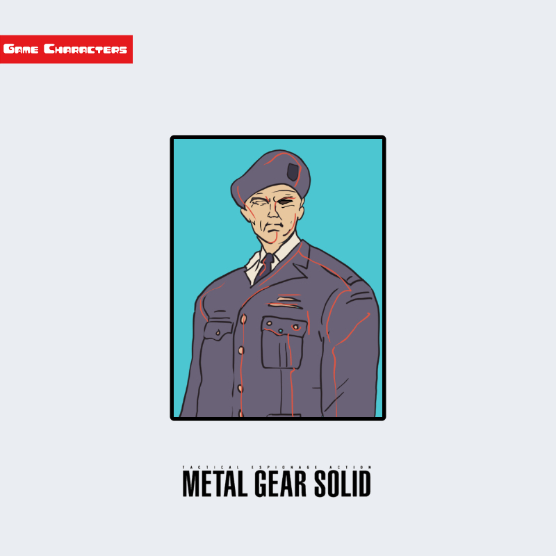 『メタルギア』シリーズに登場するロイ・キャンベルは、短髪のグレイヘアと整った顔立ちを持つ人間型キャラクターである。頭部にはベレー帽を被り、上半身には濃い青紫系の軍服を着用している。軍服はボタン留めの前開き式で、胸部に二つのポケットを備えた実用的な構造を持つ。肩には階級章が付けられており、全体として高位の軍人を象徴するデザインとなっている。構造的には「人間型」かつ「軍服融合構造」に分類される。