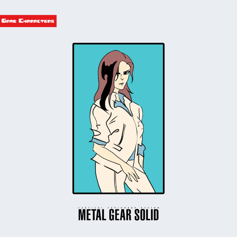 『メタルギア』シリーズに登場するローズマリーは、長い赤褐色の髪を持つ人間型キャラクターである。髪は中央分けで顔の両側に垂れ、毛先は肩下まで自然に流れる。衣装は淡いベージュのシャツとパンツを基調としており、日常的な服装構成に分類される。装飾や軍装要素は見られず、全体として柔らかな素材感とシンプルな輪郭を持つデザイン。構造的には「人間型」かつ「日常衣服構造」に属する。