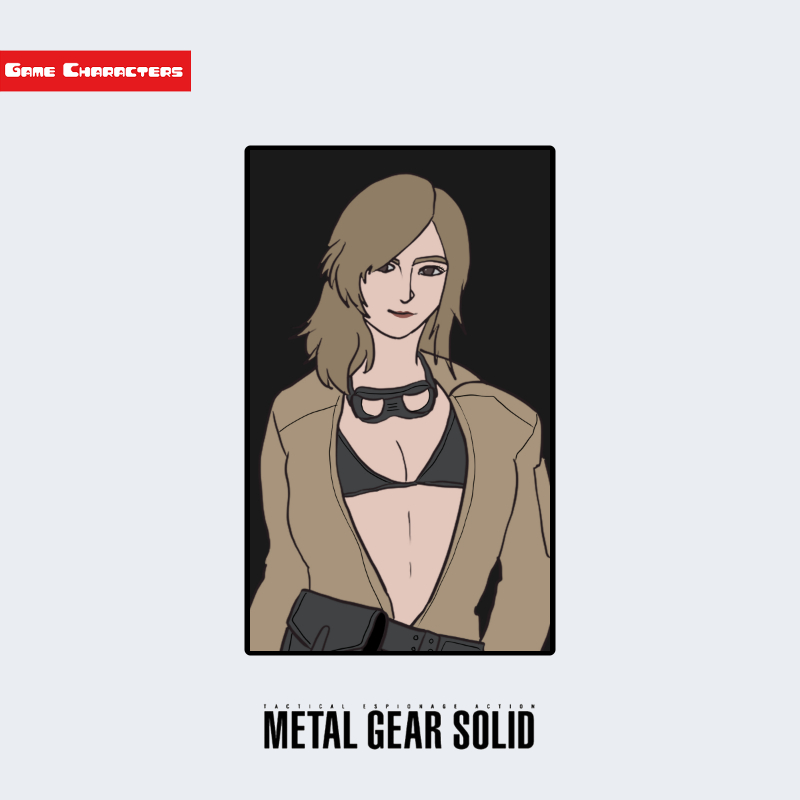 『メタルギア』シリーズに登場するEVAは、金髪を肩まで伸ばした人間型キャラクターである。髪は緩やかなウェーブを描き、前髪は片側に流すように整えられている。衣装はブラウン系のジャケットと、胸元を大きく開いた黒いインナーで構成され、腰にはベルトと装備ホルダーを備えている。全体として機能性と大胆さを併せ持つ装束構成をとっており、「人間型」かつ「戦闘服融合構造」に分類される。
