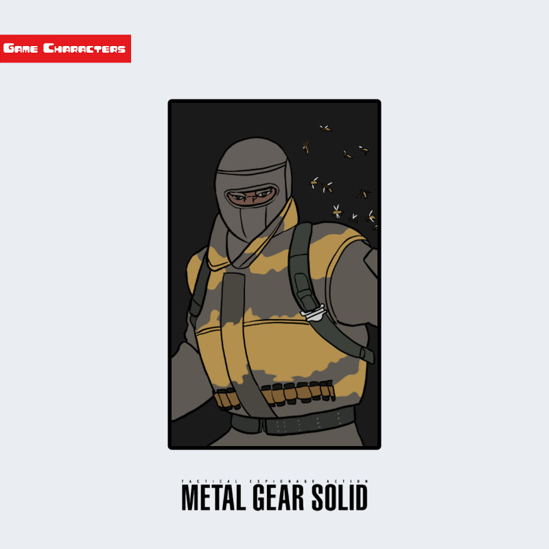 『メタルギア』シリーズに登場する至高の痛み ザ・ペインは、防護装備を身に着けた人間型キャラクターである。頭部から顔にかけて防護マスクを装着し、黄色と黒のツートンカラーの防弾ベストを着用している。衣装は全体的に厚みがあり、胸部には複数のストラップと装備ベルトが確認できる。周囲には小型の昆虫の群れが漂い、視覚的にも異質な存在感を与える構造を持つ。分類上は「人間型」かつ「防護装備融合構造」に該当する。