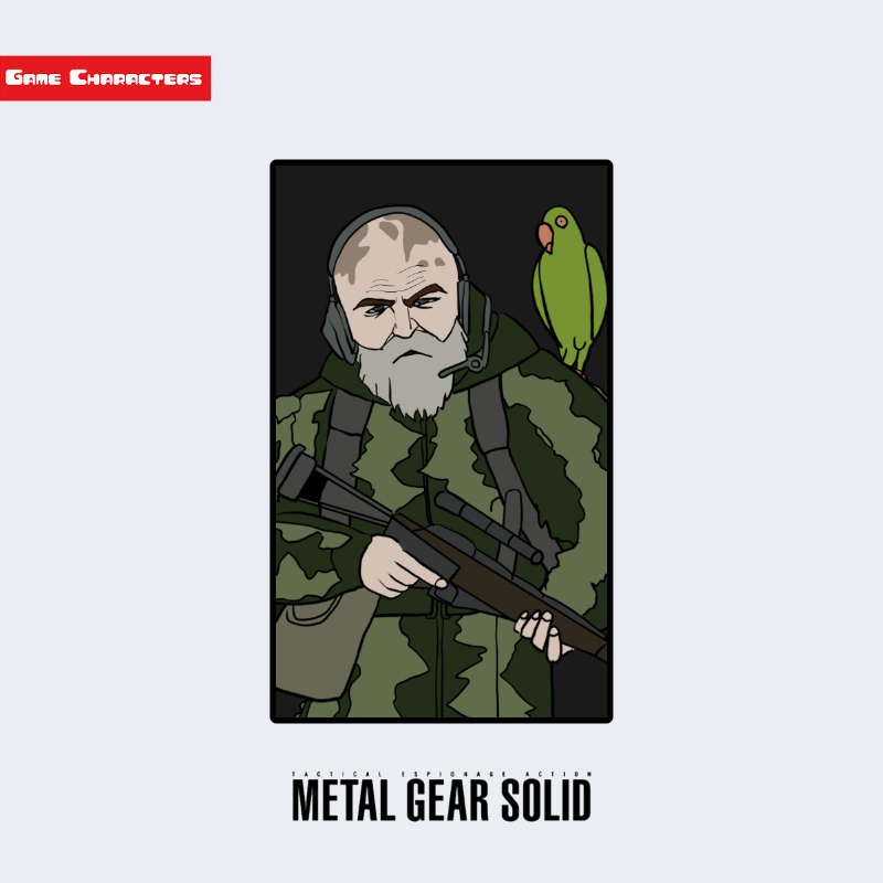 『メタルギア』シリーズに登場する真実の終焉 ジ・エンドは、長い白髭と頭頂部の薄い老年の男性キャラクターである。全身は森林迷彩柄の戦闘服で覆われ、肩からは狙撃用ライフルを下げている。背部には緑色のオウムがとまっており、自然との一体感を象徴する構成となっている。服装全体は重厚かつ実用的で、迷彩パターンと装備の配置が機能美を持つ。分類上は「人間型」かつ「迷彩装備融合構造」に該当する。