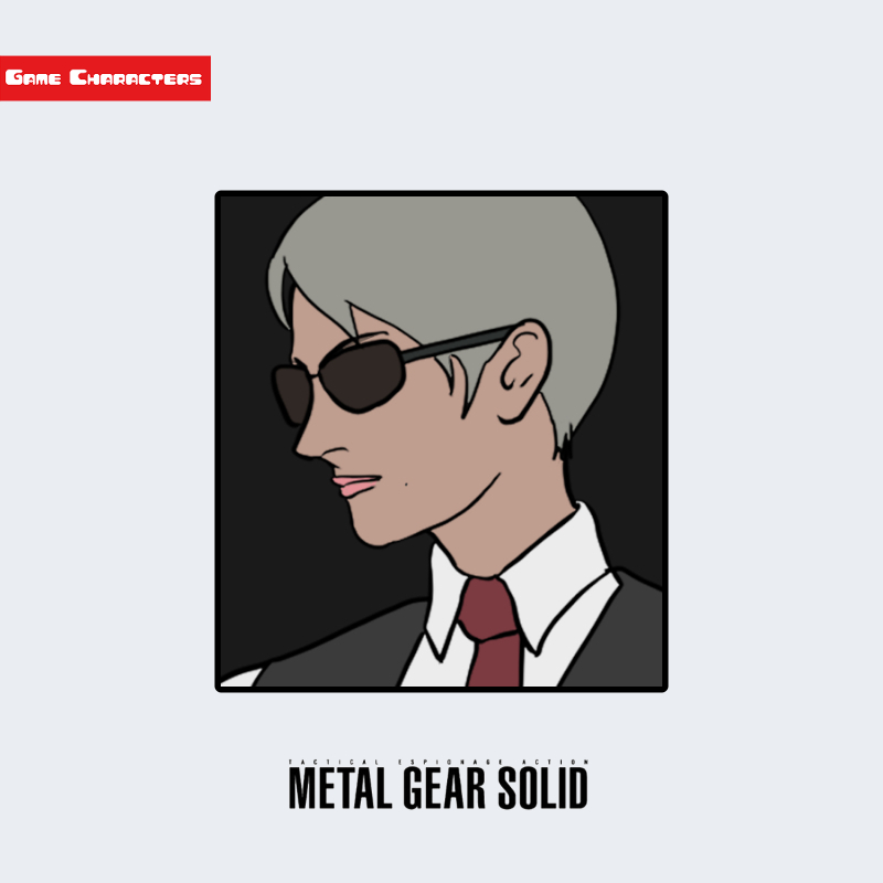 『メタルギア』シリーズに登場するストレンジラブは、灰色がかったショートヘアを持つ人間型キャラクターである。髪は耳を覆わずに横に流れる構成で、後方にかけて自然にまとまっている。衣装は白いシャツに赤いネクタイ、黒のスーツジャケットを合わせたシンプルなフォーマルスタイルで、知的な印象を強調する構造を持つ。加えて、黒いサングラスを着用しており、視線を隠すことで冷静な印象を際立たせている。「人間型」かつ「スーツ融合構造」に分類される。