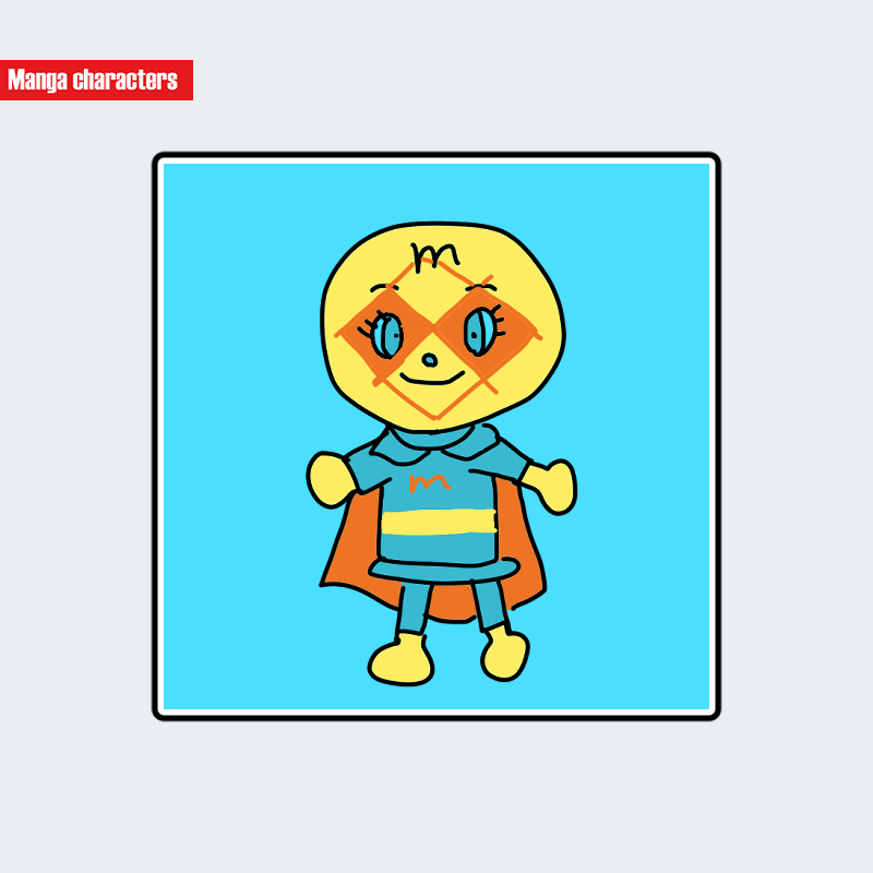 『それいけ!アンパンマン』に登場するメロンパンナちゃんは、丸みのある黄色い頭部にメロン特有の格子状ラインが描かれた、食品モチーフ一体型の外観が特徴である。顔面は青い瞳と赤い頬が左右対称に配置され、シンプルながら強い記号性を持つ。衣装は水色を基調としたワンピース型で、胸部中央の「M」字パーツと、背面へ流れるオレンジ色のマントが視覚的アクセントとなる。手袋とブーツは黄色で統一され、全体の配色が頭部の色味と連動する。「ヒーロー記号強調型」に分類され、アンパンマン系統の丸顔デザインと共通する構造を保持している。