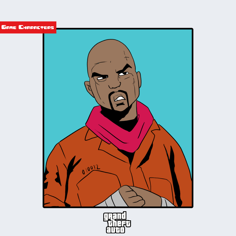 『グランド・セフト・オート』シリーズに登場するエイトボールは、坊主頭に近い短髪と濃い眉、力強い顎のラインを持つ男性キャラクターである。画像ではオレンジ色のジャケットを着用し、首元には赤いスカーフ状の布を巻いている。衣装の色彩対比が強く、視覚的に高い識別性を持つ点が特徴である。全体構造は「作業服融合型」に分類され、実務的な装備デザインを持つ。他キャラクターのクロードと比較すると、より現場的・整備系の印象を与える造形である。