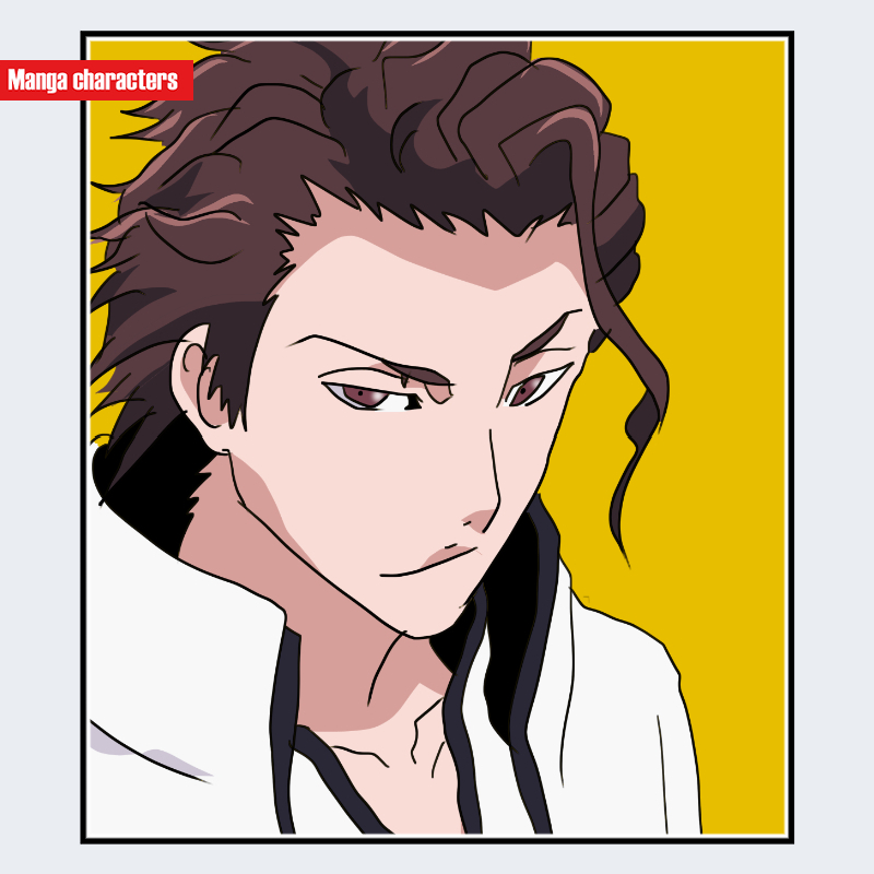 『BLEACH』に登場する藍染惣右介は、額から後頭部へかけて滑らかに後ろへ流す「後流れウェーブ型」の髪構造を持つ。前髪は中央で大きく分岐し、額の上に鋭いV字ラインを形成している。側頭部の髪は頬に沿って細く垂れ、頭部の縦ラインを強調する役割を持つ。衣装は白を基調とした外装レイヤーで、襟元が立ち上がる直線構造が首まわりの輪郭を明確に分断し、髪のウェーブレイヤーとの二層視覚階層を作り出している。