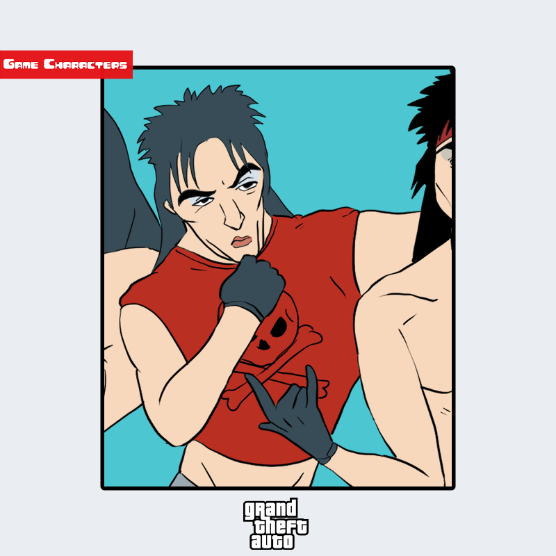 『グランド・セフト・オート』シリーズに登場するギター・パーシーは、黒髪を後ろに流し、露出の多い赤いノースリーブシャツを着用した男性キャラクターである。胸元にはドクロのシンボルが描かれており、ロックバンド特有の装飾的モチーフを強調している。腕には黒い手袋を着用しており、全体的に「音楽装飾型」に分類される。同バンド「Love Fist」内の他メンバーと比較すると、舞台演出における攻撃的・象徴的造形を担う構造である。