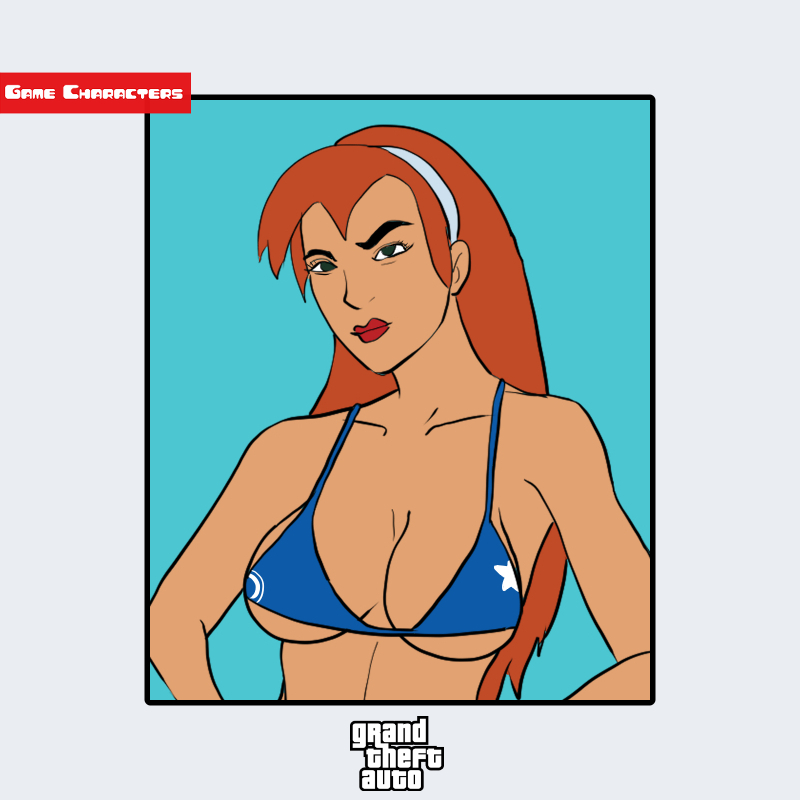 『グランド・セフト・オート』シリーズに登場するキャンディ・サックスは、赤髪のロングヘアと引き締まった体型を特徴とする女性キャラクターである。画像では青いビキニを着用し、星柄の装飾が施されている。全体構成は「舞台装飾型」に分類され、強調された色彩とシルエットが視覚的アイコンとして機能している。同作品内のLove Fist関連キャラクターと比較すると、よりパフォーマンス性を意識したステージ向けデザインが採用されている。