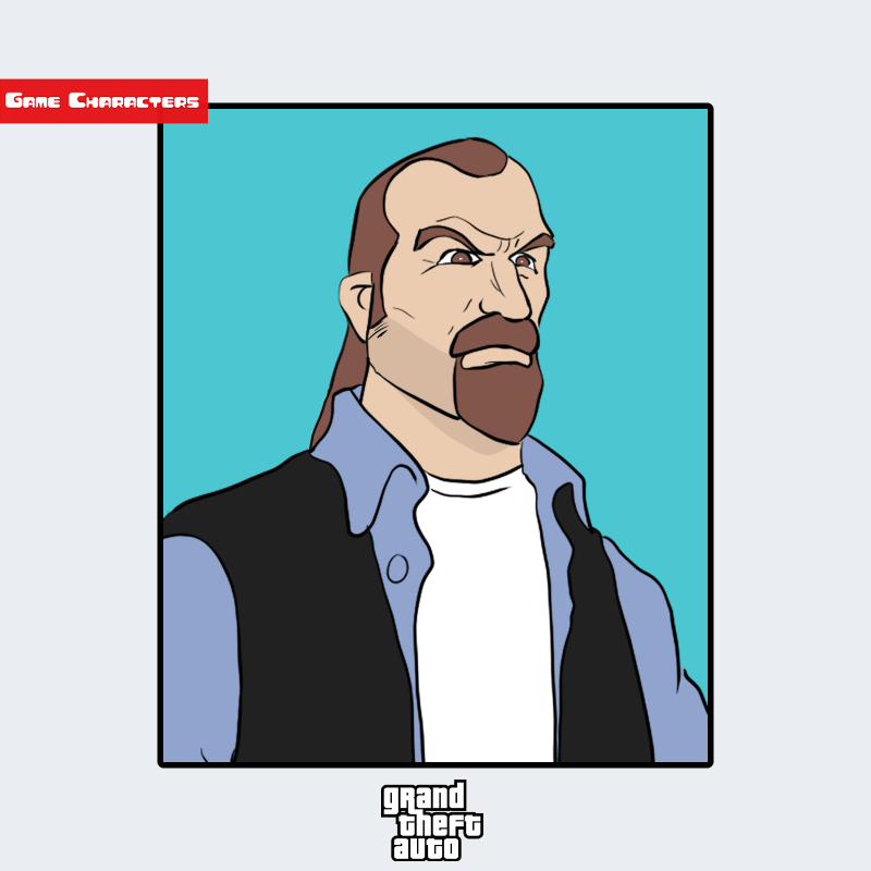 『グランド・セフト・オート』シリーズに登場するビッグ・ミッチ・ベイカーは、後退した額と長く束ねた髪、顎ひげを特徴とする男性キャラクターである。画像では白いシャツの上に黒いベストを重ね、袖口が見える淡い青のシャツが下に覗いている。全体的な衣装構成は「ミリタリーカジュアル型」に分類され、無骨さと統一感を併せ持つ。トミー・ベルセッティのカジュアル装飾型と比較すると、より重厚で落ち着いた衣装設計がなされている。
