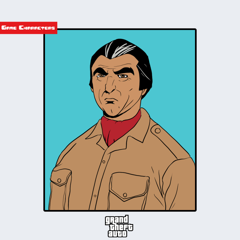 『グランド・セフト・オート』シリーズに登場するファン・ガルシア・コルテスは、黒髪を後方に流し、端正な輪郭を持つ男性キャラクターである。画像では茶色の軍装風ジャケットを着用し、首元には赤いスカーフを巻いている。衣装全体の構成は整然としており、「軍装融合型」に分類される。スーツ型の人物(例:ソニー・フォレッリ)と比較すると、より実務的かつ指揮官的な印象を与える造形である。