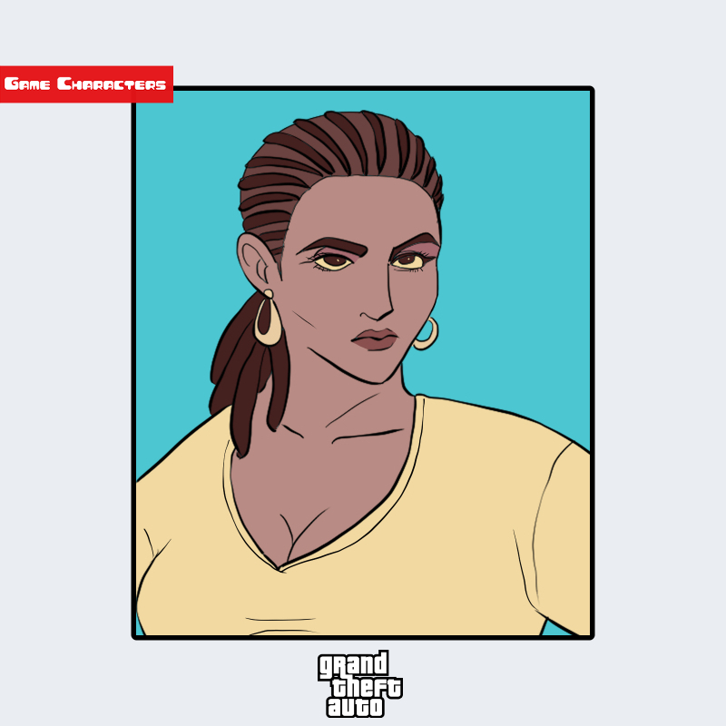 『グランド・セフト・オート』シリーズに登場するエリザベータ・トーレスは、強い存在感を放つ女性キャラクターとして描かれている。画像では、後ろで束ねた長い髪、鋭い目つき、そして大ぶりのイヤリングが印象的である。衣装はシンプルなベージュ系トップスで、胸元の開きが強調され、輪郭のはっきりした顔立ちと相まって力強さを感じさせる。全体的に「都市系リアリズム構造」に分類される造形であり、人物像としての重厚感を持つ。