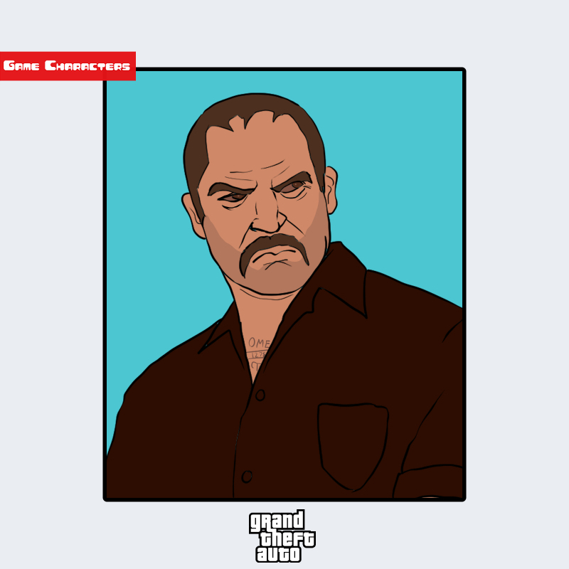 『グランド・セフト・オート』シリーズに登場するブラッド・グレボフは、短髪と濃い口ひげを特徴とする中年男性のキャラクターである。画像では、濃い茶色のシャツを着用し、襟元を開けた姿が確認できる。眉の角度が強く、やや下向きの視線と口元の形状が構造的に緊張感を生み出している。衣装はシンプルながらも厚みのある布地で構成され、全体として「クラシックリアリズム構造」に分類される。