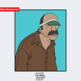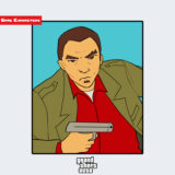 『グランド・セフト・オート』シリーズに登場するレイ・ブルガーリンは、短髪で口ひげを蓄えた中年男性のキャラクターである。画像では、黒のコートを羽織り、内側には赤のシャツを着用している。片手には葉巻を持ち、もう一方の手で口元へ近づける仕草が確認できる。この動作と造形は、権威性を演出する記号的構造として設計されている。全体として「クラシックリアリズム構造」に分類され、同シリーズ内の都市社会的造形群に属する。