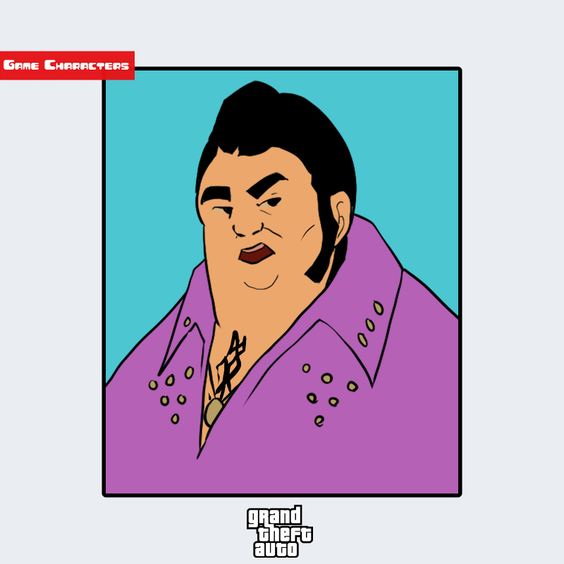 『グランド・セフト・オート』シリーズに登場するレスター・リリックは、濃い髪色と独特なシルエットを持つ男性キャラクターである。画像では、光沢のある紫色のシャツを着用し、襟を大きく開けた構成が特徴的である。胸元には刺青が見え、ボタン部分には装飾が施されている。髪型は厚みのあるオールバックで、顔の輪郭は丸みを帯びている。全体として「ショービジネス調リアリズム構造」に分類され、舞台的造形意識が強い。