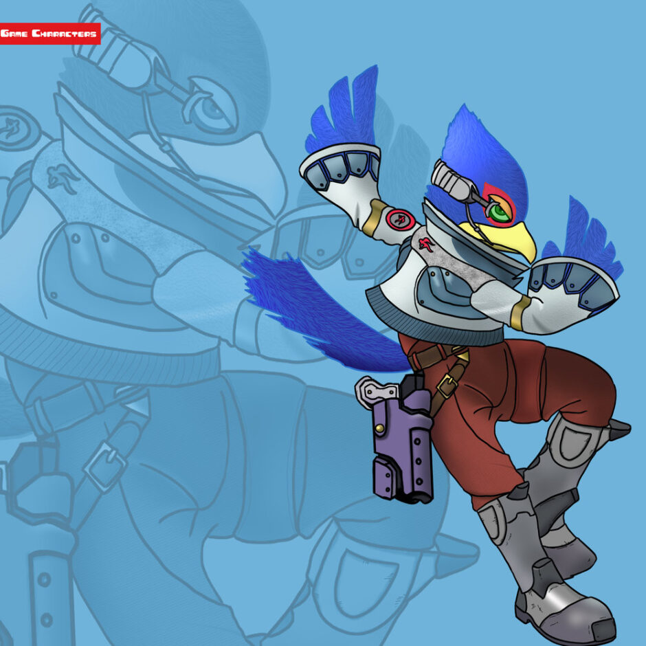 『スターフォックス64(1997年)』に登場するファルコは、青い羽毛を持つ鳥型の擬人化キャラクターである。頭部は嘴と赤いアイマークが特徴的で、目は鋭く強調されている。上半身は白いジャケットを基盤とし、首元には赤いスカーフを巻いている。腰部には装具やベルトを備え、脚部は茶色のズボンとブーツで統一されている。体格は細身で高く、動物的要素と人間のパイロット装備を融合させた構造を持つ。構造分類は「擬人化軍装型」に属し、同作のフォックスと比較すると、より派手な色彩と装飾性を持つ外観である。