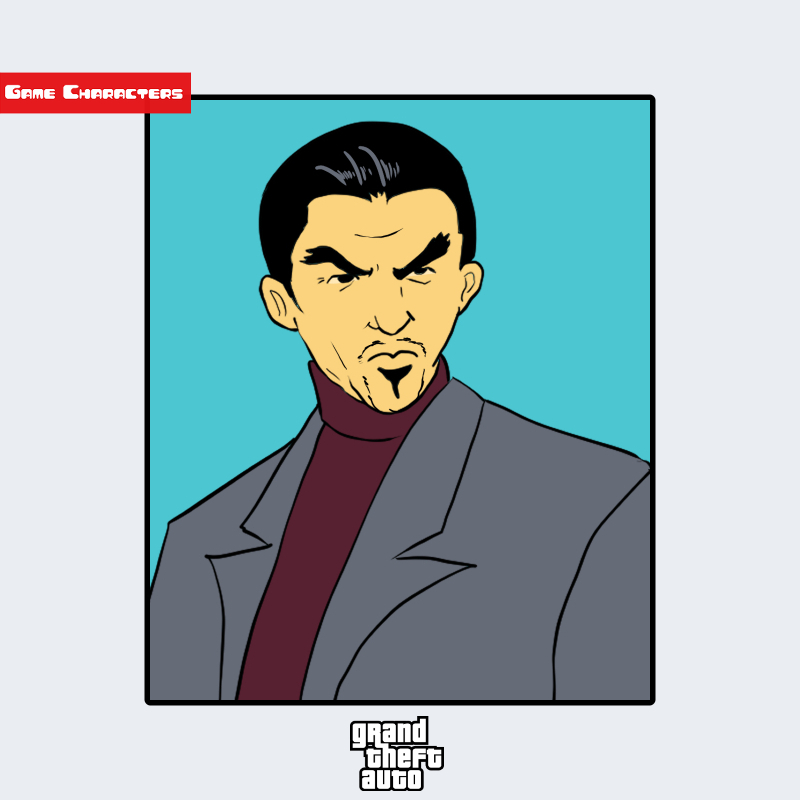 『グランド・セフト・オート』シリーズに登場するチョウ・ミンは、黒髪をオールバックに整えた中年男性のキャラクターである。画像では、グレーのスーツジャケットに赤紫のタートルネックを合わせ、首元に明確な色対比を持たせた衣装構造となっている。眉や目元の線が強調され、顔全体が角ばった印象の造形で統一されている。全体として「クラシックリアリズム構造」に分類され、同シリーズの組織系キャラクターデザインに共通する造形要素を持つ。