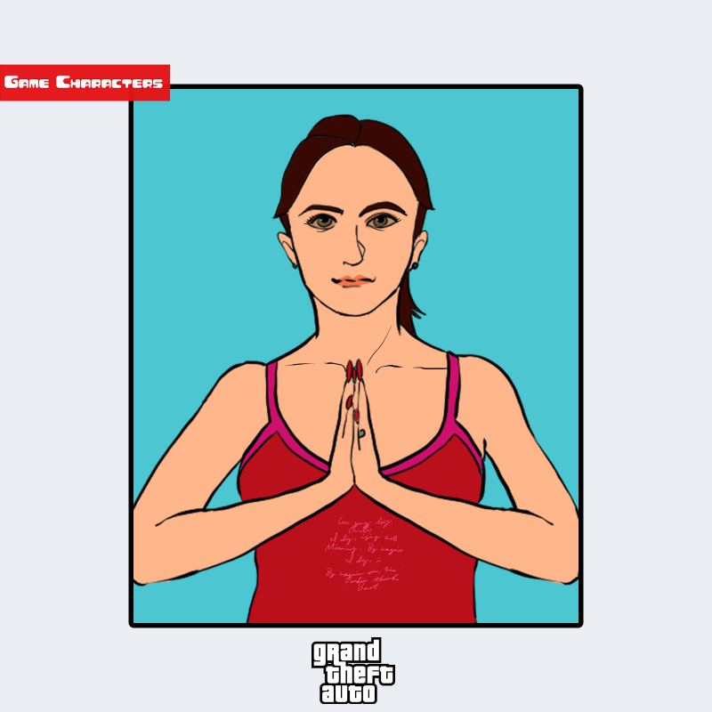 『グランド・セフト・オート』シリーズに登場するアマンダ・デサンタは、赤いスポーツブラ風トップスを着用した女性キャラクターである。画像では、両手を胸の前で合わせた姿勢をとり、身体の中心線を意識した対称的なポーズとなっている。髪は後ろでまとめられ、衣装は運動やヨガを想起させる軽装構造を持つ。全体として「アクティブリアリズム構造」に分類され、健康志向的造形を反映した現代的デザインに位置づけられる。