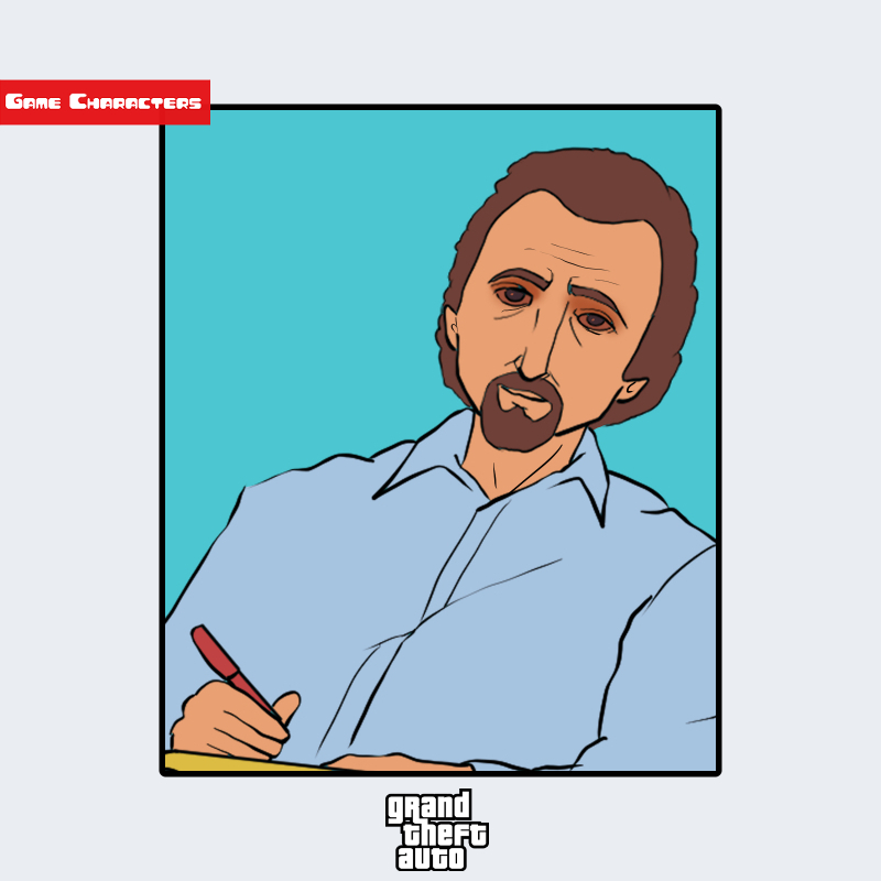 『グランド・セフト・オート』シリーズに登場するアイザイア・フリードランダーは、中年男性として描かれるキャラクターである。画像では、明るい水色のシャツを着用し、首元をやや開いたスタイルを取っている。髪は茶色で短く、顎ひげが顔の輪郭に沿って整えられている。手にはペンのような細長い物を持ち、思索的なポーズを取っている点が特徴的である。全体として「モダンリアリズム構造」に分類され、専門職的な造形バランスを持つ。