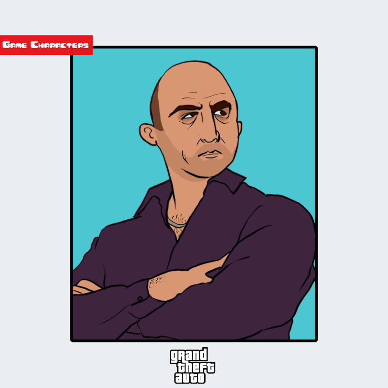 『グランド・セフト・オート』シリーズに登場するシミオン・イエタリアンは、短髪で額の生え際が後退した中年男性キャラクターである。画像では、紫色のシャツに黒のジャケットを羽織り、腕を組んだ姿勢を取っている。襟元は開かれており、カジュアルさと威圧感を併せ持つ衣装構成になっている。顔の輪郭は細く、目元や眉の線が鋭く強調されている。全体として「モダンリアリズム構造」に分類され、同シリーズの実業家系デザインの一類型といえる。