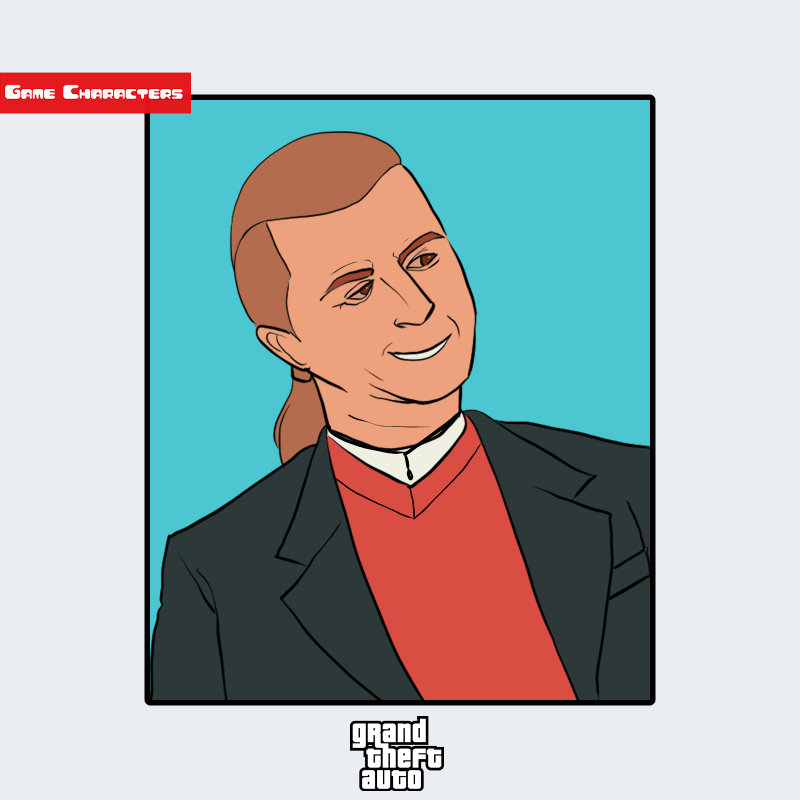 『グランド・セフト・オート』シリーズに登場するラズロウ・ジョーンズは、後ろで束ねた長めの金髪と整えられた髭を持つ男性キャラクターである。画像では、黒いジャケットに赤いインナーシャツを合わせ、白いハイネックの襟元が覗いている。全体の配色はコントラストが強く、フォーマルとカジュアルの中間的デザインに分類される。首元のレイヤー構造が特徴的で、全体として「モダンリアリズム構造」に属する。