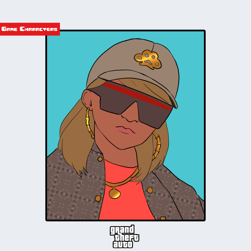 『グランド・セフト・オート』シリーズに登場するセッサンタは、金髪を長く伸ばし、帽子と大型のサングラスを着用した女性キャラクターである。画像では、赤いトップスに薄いブラウンのジャケットを重ね、首元や耳元にゴールドのアクセサリーを身につけている。衣装はヒップホップファッションを基調とした都市型デザインで、装飾と配色のコントラストが強い。全体として「アーバンストリート構造」に分類される。