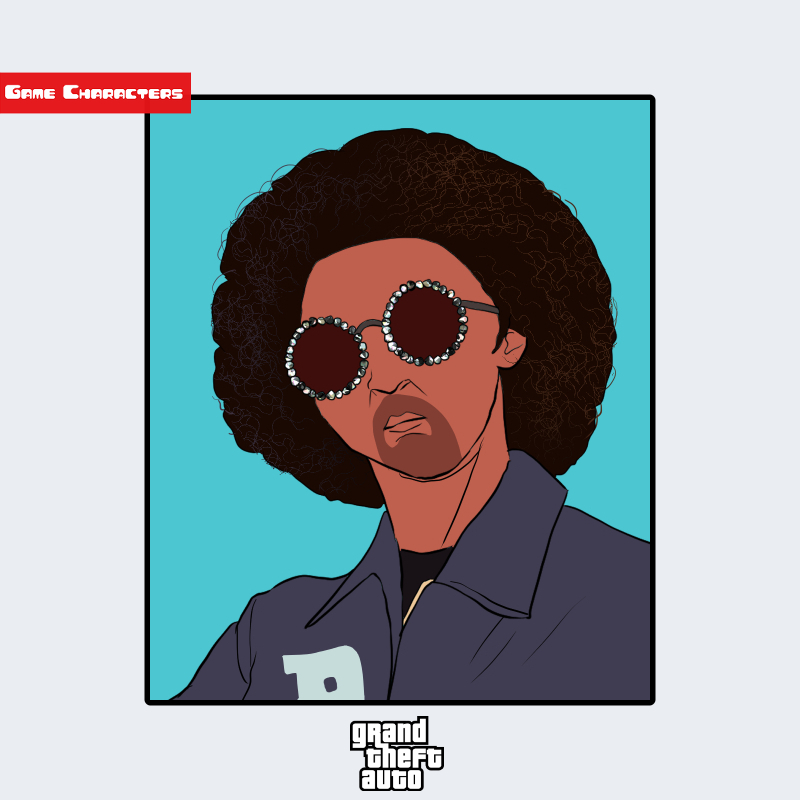 『グランド・セフト・オート』シリーズに登場するムーディーマンは、大きなアフロヘアと円形サングラスを特徴とする男性キャラクターである。画像では、濃紺のジャケットにオレンジのシャツを重ねたスタイルで描かれており、全体的に音楽業界を想起させる造形バランスとなっている。首元にはアクセサリーなどの装飾は見られず、衣装の配色とシルエットが主な視覚的ポイントとなっている。構造分類としては「アーバンリアリズム構造」に属する。
