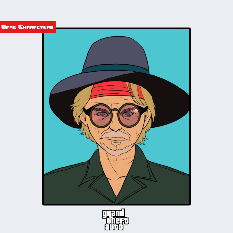 『グランド・セフト・オート』シリーズに登場するエル・ルビオは、金髪にバンダナを巻き、丸いサングラスをかけた男性キャラクターである。画像では、黒いシャツの上に開いた襟元が見え、胸元のネックレスがアクセントになっている。さらに、つばの広い黒いハットを着用しており、全体の構成はリゾートとアンダーグラウンドを融合させた造形バランスとなっている。これらの特徴から「ラテンラグジュアリー構造」に分類される。