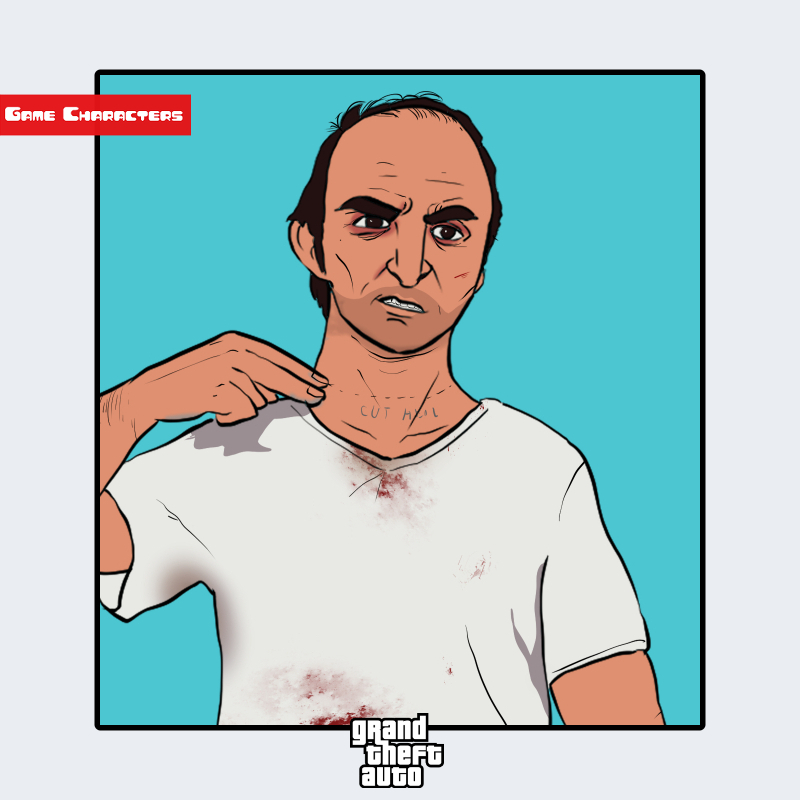 『グランド・セフト・オート』シリーズに登場するトレバー・フィリップスは、短髪で鋭い表情を持つ男性キャラクターである。画像では、白いTシャツを着用し、首元や胸元には汚れが見られる。Tシャツの薄手構造と無造作なシワの描写が、生活感や行動性を強調している。首にはタトゥーが刻まれており、他キャラクターの整った衣装構造とは対照的に、粗野な造形美を特徴とする「ラフカジュアル構造」に分類される。