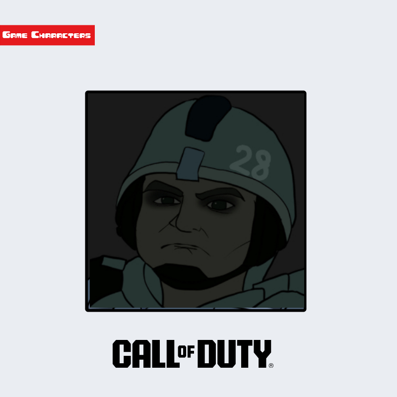 『コール オブ デューティ』シリーズに登場するバスケスは、防弾ヘルメットと戦闘服を装備した兵士型のキャラクターである。ヘルメットには「28」の識別番号が描かれており、部隊内での識別要素として機能している。装備全体は緑系統の迷彩色で統一され、首元まで覆う防護スーツが「重装備防護型」の構造を示す。顔部分の露出が少なく、装甲と服地が密接に接合された設計で、戦闘時の防御を優先した造形である。