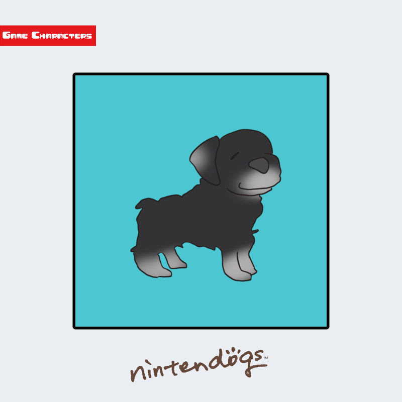 『nintendogs』に登場するミニチュア・シュナウザーは、がっしりとした体格と特徴的な被毛構造を持つ小型犬として描かれている。全体的に黒と灰の2色で構成され、胸部や脚先にかけて淡いグラデーションが見られる。顔周りの毛はやや長く、口ひげのような形状をしている点が特徴的である。耳は垂れ下がり、体全体に均整の取れた印象を与えている。視覚的には「長毛犬型構造」に属し、同シリーズ内の短毛犬種(例:パグやチワワ)と比較すると、毛の密度と立体感が強いデザインとなっている。