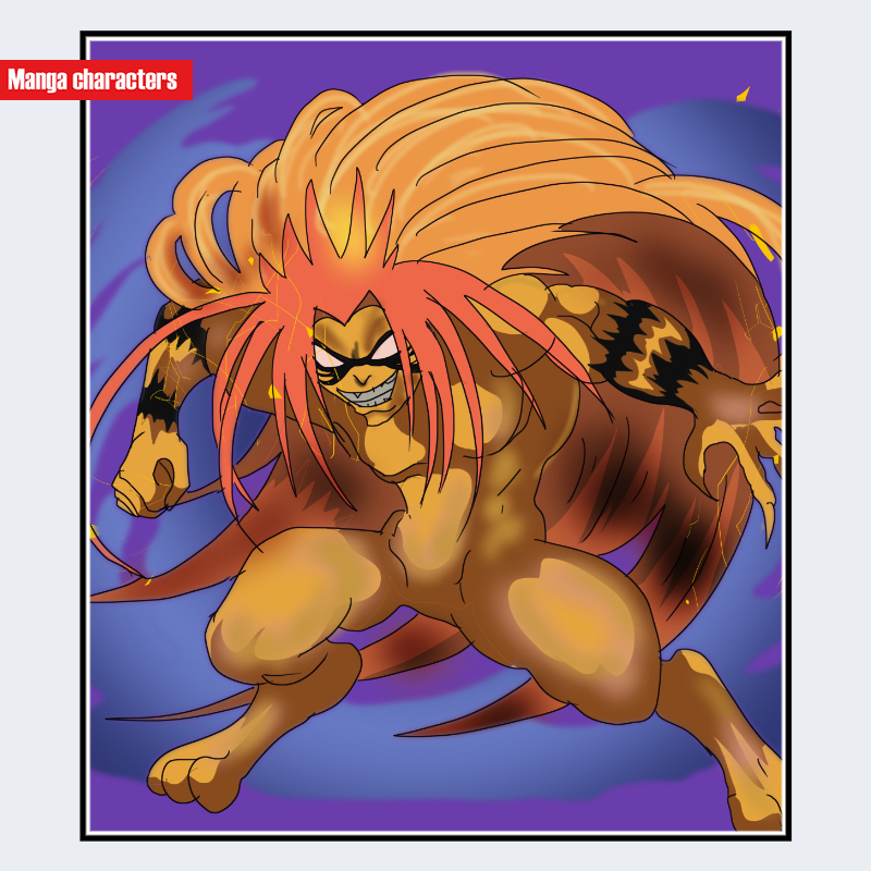 虎を思わせる配色は他作品にも見られるが、「放射状に広がる巨大な毛束」「黒い顔面模様」「橙色と黒の強い縞構造」という三点の組み合わせは本キャラ固有であり混同しにくい。