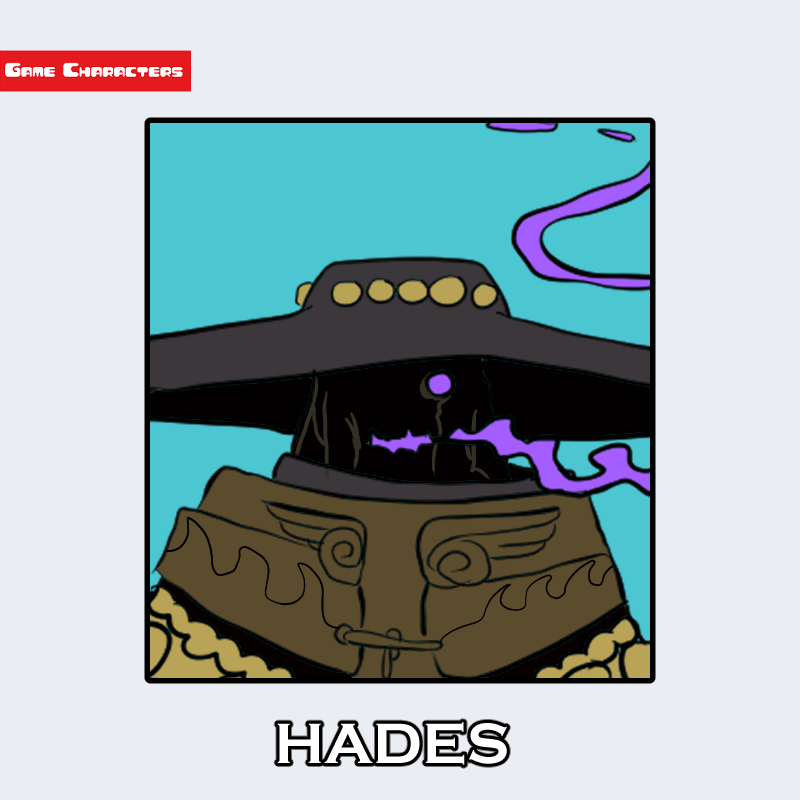 『HADES』に登場するカロンは、顔を覆うように黒い影をまとい、大きなつば広帽をかぶった人物型キャラクターである。上半身には金色の紋様が刻まれた衣装を着用し、全体的に重厚で対称的な装飾構造を持つ。肩から下に流れる衣は波状の文様が刻まれ、闇を媒介する存在としての視覚的統一が図られている。構造的には「冥界儀礼構造」に分類され、同作の神格系キャラクターとは異なり、静的・象徴的デザインを基盤としている。